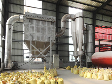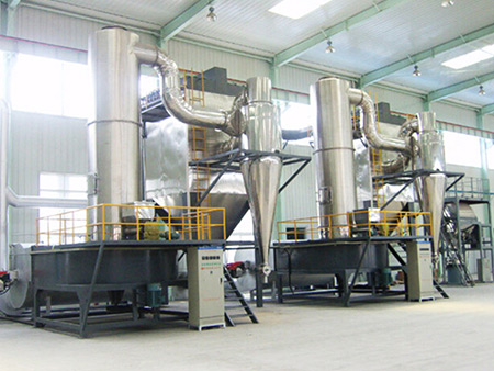 熱空氣切線進(jìn)入干燥器底部,在攪拌器帶動下形成強(qiáng)有力的旋轉(zhuǎn)風(fēng)場。膏狀物料由螺旋加料器進(jìn)入干燥器內(nèi),在高速旋轉(zhuǎn)攪拌槳的強(qiáng)烈作用下,物料受撞擊、磨擦及剪切力的作用下得到分散,塊狀物料迅速粉碎,與熱空氣充分接觸、受熱、干燥。脫水后的干物料隨熱氣流上升,分級環(huán)將大顆粒截留,小顆粒從環(huán)中心排出干燥器外,由旋風(fēng)分離器和除塵器回收,未干透或大塊物料受離心力作用甩向器壁,重新落到底部被粉碎干燥。